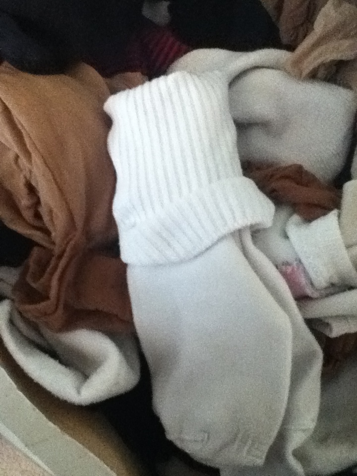 Using a Sharpie, I painstakingly inscribed a letter M on the inside of each cuff to mark each white bootie as mine. No one else’s. This package was particularly large, so I was fortunate enough to relish the joyous comfort of wearing new socks over and over again for about one month.